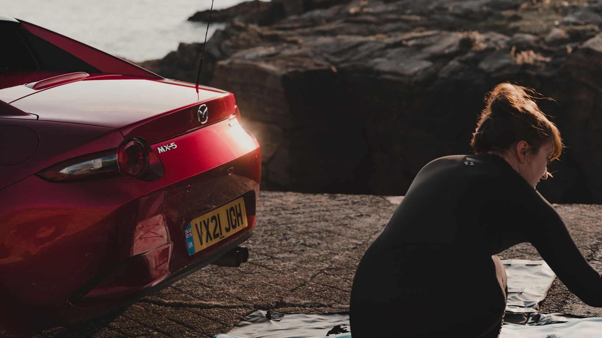 Ik heb nooit het rijplezier van een cabrio willen inruilen voor het gebruiksgemak van een grotere auto. Met de MX-5 hoeft dat gelukkig ook niet. De bagageruimte biedt eenvoudig plaats aan een opblaasbare SUP-board. En dan blijft er zelfs nog ruimte over voor een wetsuit en een thermosfles met hete koffie. Ik probeer het SIPA-board uit, een innovatieve elektrische SUP (Stand-Up Paddleboard) die dezelfde motor gebruikt om de board zowel op te blazen als voort te bewegen. In tegenstelling tot veel andere cabrio’s is de bagageruimte van de MX-5 altijd hetzelfde, of de kap nu omhoog of omlaag is. Het fastback-mechanisme is een staaltje techniek op zich en komt enorm handig van pas in wispelturige klimaten. Na een duik in de Atlantische Oceaan nestel ik me achter het stuur om het snelle dakmechanisme in actie te zien vanuit mijn verwarmde stoel.