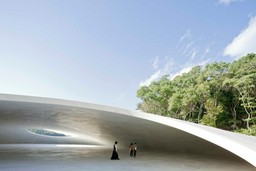 Boven: Luchtfoto van Teshima. Beeld: Iwan Baan; Midden: Zicht op Matrix. Beeld: Iwan Baan; Onder: Matrix, 2010, Teshima Art Museum, Kagawa. Beeld: Noboru Morikawa.