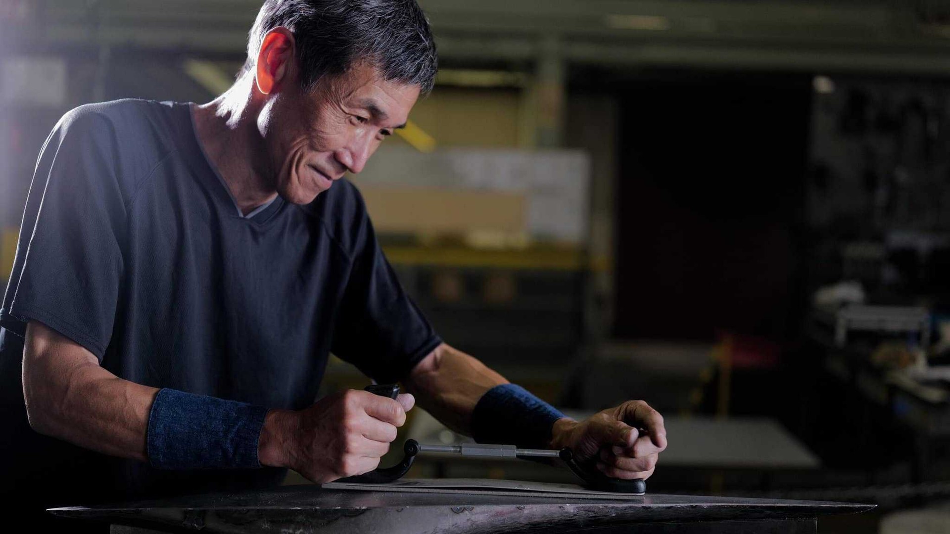 Het is deze morgen heet en vochtig in Hiroshima. En het is overal druk. Forensen haasten zich om de trein te halen, kinderen fietsen naar school en koffieshops draaien op volle toeren om al die koffies to-go te maken. Maar Yutaka Kawano, senior specialist bij de Design Modelling Studio, is al met heel andere dingen bezig. Op zijn werkbank liggen tientallen ijzeren en houten hamers, en vlijmscherpe scharen om plaatstaal te knippen. Terwijl achter hem generatoren zoemend tot leven komen, is Kawano klaar voor een nieuwe werkdag.