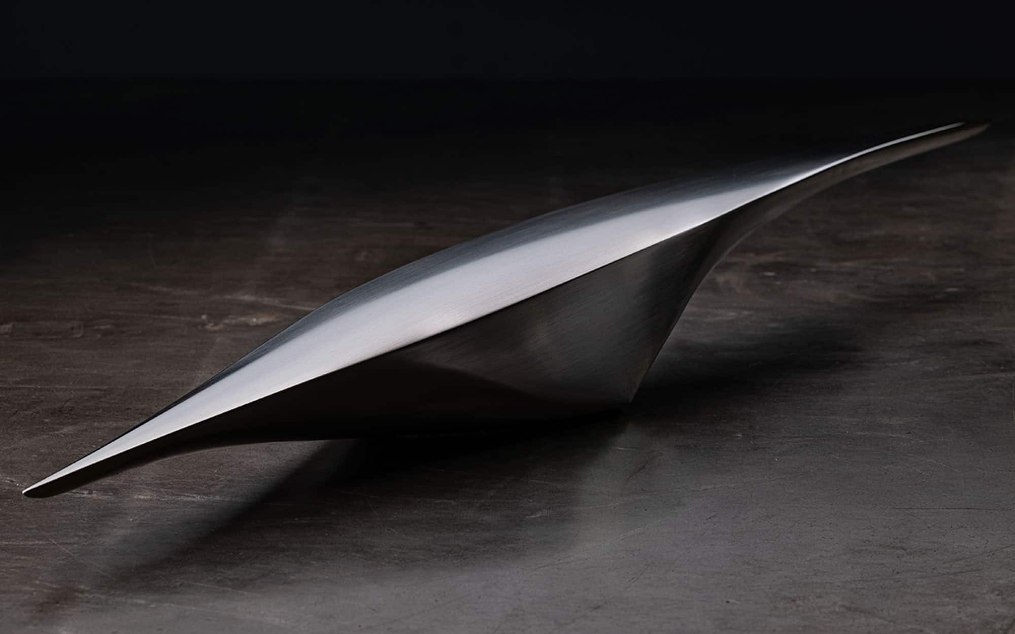 Zijn werkplaats bevindt zich in de relatief koelere Design Modelling Studio van Mazda, waar de Takumi-meester al is begonnen met het hameren en buigen van een flinterdun stukje plaatwerk. Hij manipuleert het glinsterende materiaal voor een uniek, enig-in-zijn-soort kunstwerk dat verdacht veel lijkt op aspecten die je terugziet in Mazda-modellen. Kawano werkt aan slechts één van de elf stukken die samensmelten tot een uniek object en creëert met zijn hamers, tangen en bankschroeven een Rashin-sculptuur. Het eindproduct wordt een glad, naadloos, glanzend object dat parallellen heeft met recente ontwerpen van Mazda, maar tegelijkertijd vooruitwijst naar toekomstige ontwerpidealen.