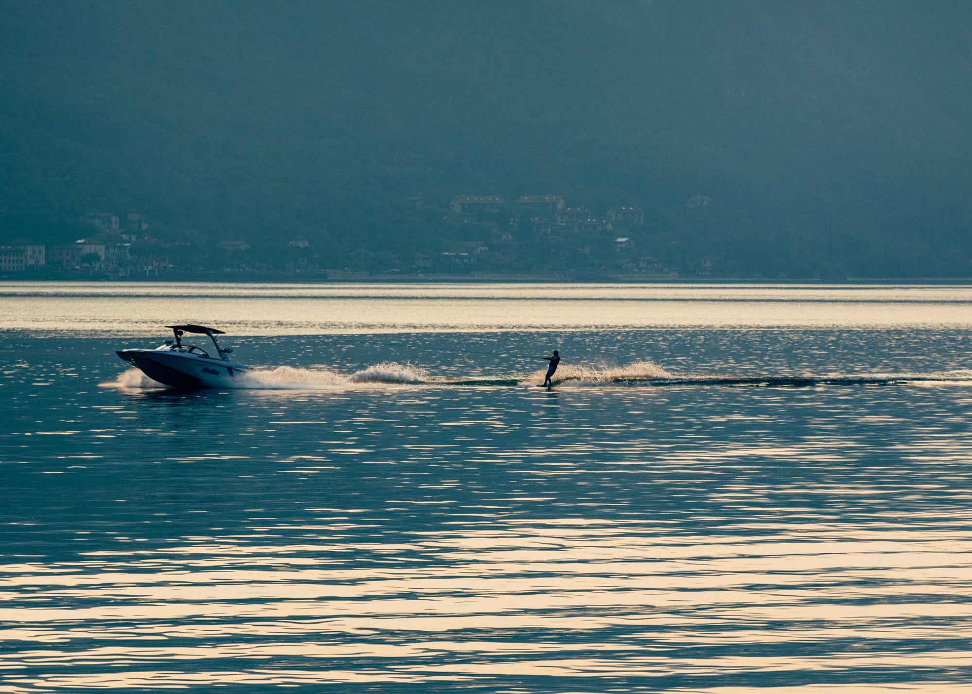 “Het enige wat we horen is het verre gegons van een watervliegtuigje dat hoge dampsporen trekt en de iconische mahonie motorboten die door het meer klieven.”