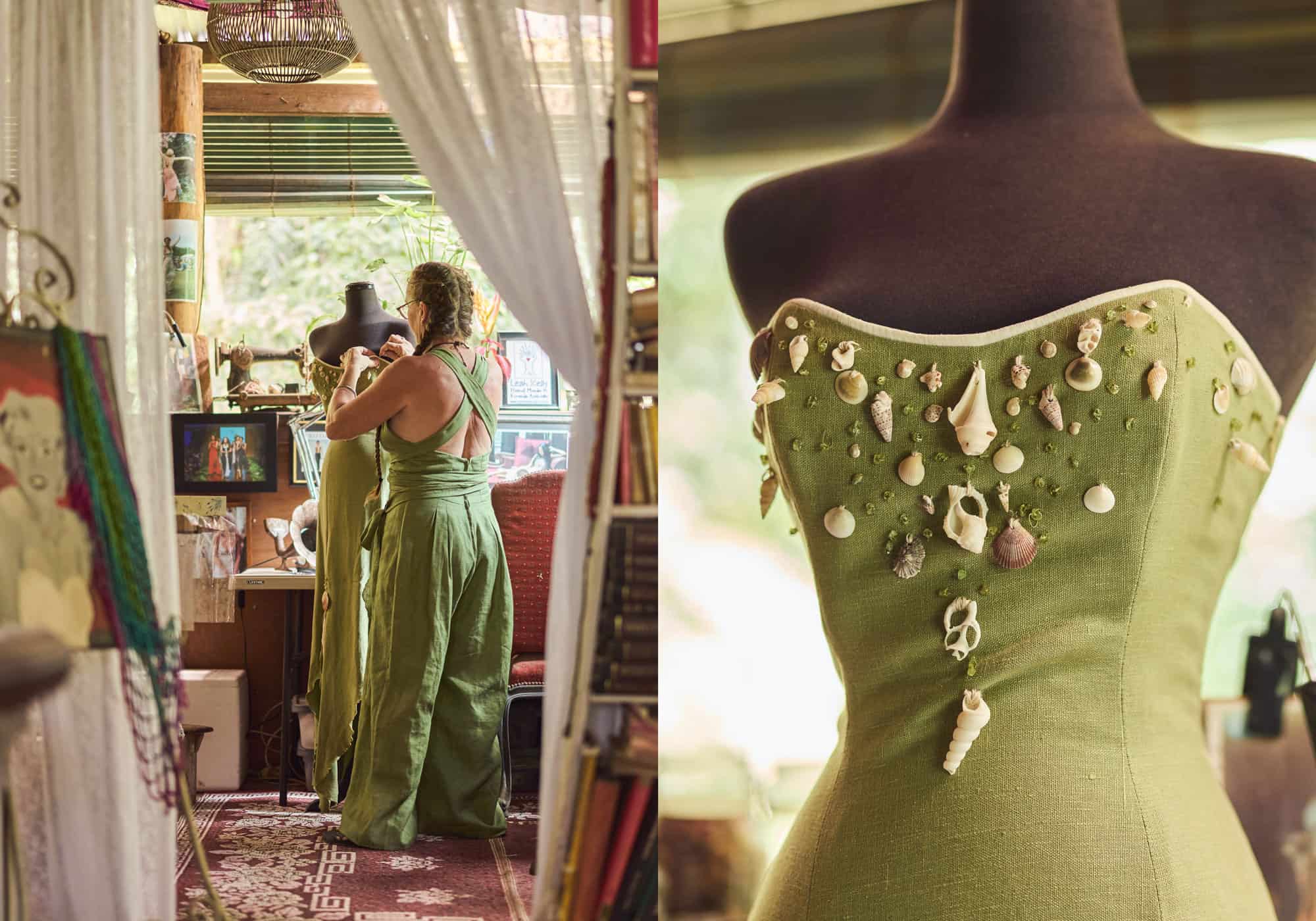 Leah Kelly is een gevierd ontwerpster die met de hand kleding maakt van biologische materialen. Als kind leerde ze naaien van haar oma. Haar stukken vallen op door het gebruik van natuurlijke materialen zoals hennep, ananasvezel en bananenboomschors. Deze maakt ze helemaal off-grid.